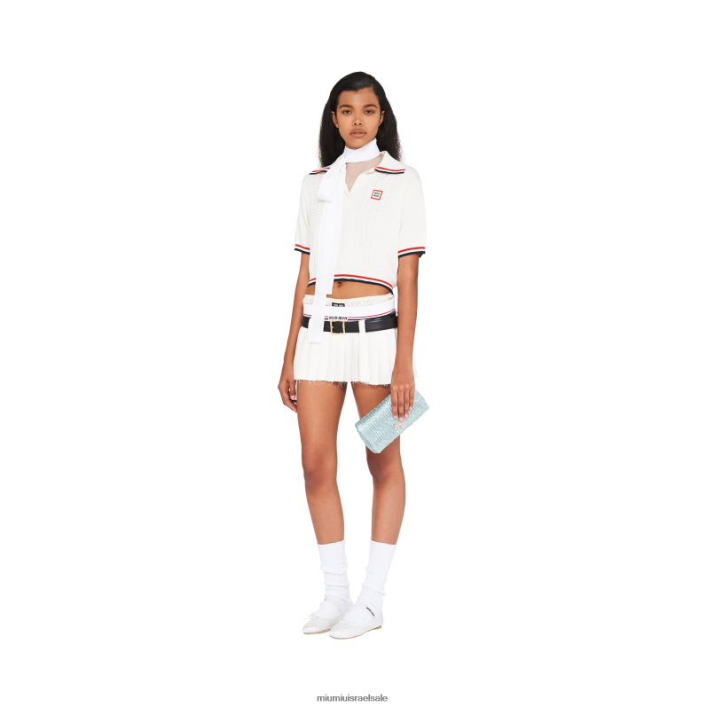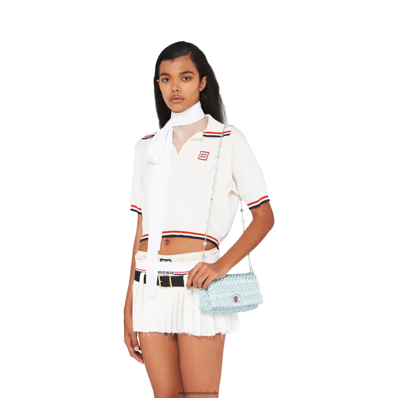 מוטיב המרקם האייקוני של miu miu מעוצב מחדש בגרסת מיקרו על תיק הסאטן הקריסטל של miu עם אופי עדין ומודרני. קריסטלים מעודנים וחומרה קטנה ממתכת מאירים את האביזר, ומזכירים את עולם התכשיטים.