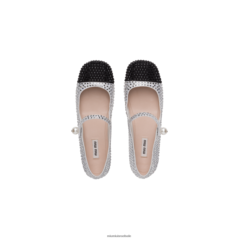 פיתוי רומנטי מאפיין את דירות הבלט היוקרתיות הללו עם אזכורים איקוניים. הנעל משובצת הקריסטל מסנוורת עם נצנצים נוצצים. פנינת Miu Miu הסמלית מקשטת את הנעל, ומזכירה את עולם התכשיטים.