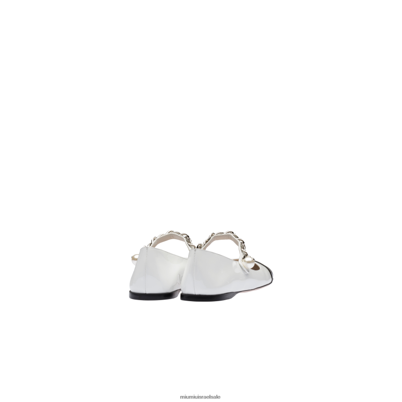 ניגודיות הרמונית של חומרים משפרת את הבלרינות האלגנטיות והעדינות הללו. שרשרת מתוחכמת מדגישה את הצללית שהושלמה על ידי פנינת Miu Miu האייקונית על הסגירה. הניגוד הכרומטי בין הבוהן לחלק העליון מזכיר סגנונות רטרו שקיבלו טוויסט מודרני.