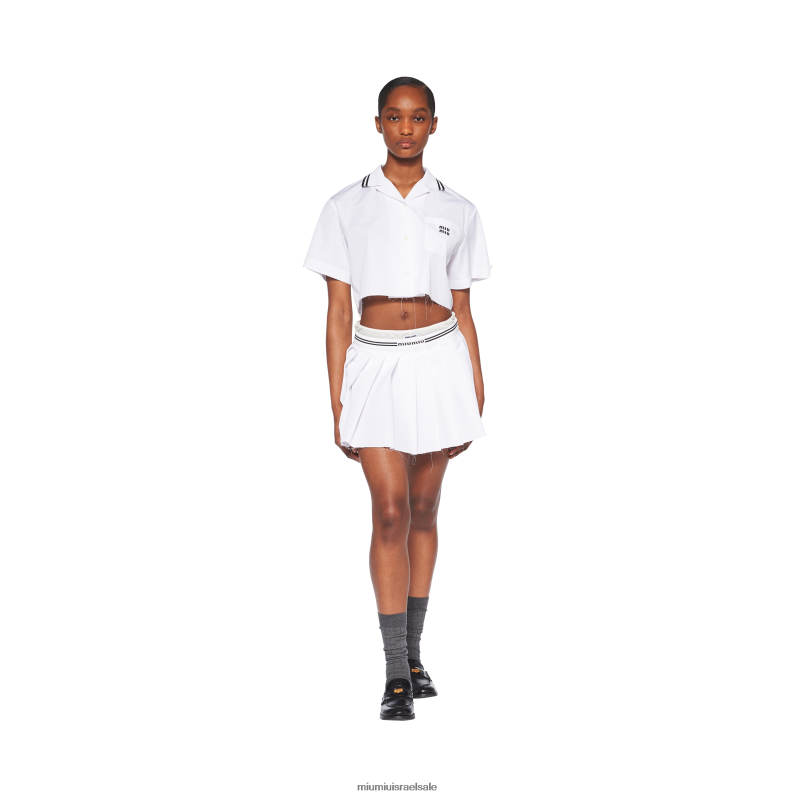 חולצת פופלין זו נוצרה בהשראת עולם הטניס שפורש מחדש על ידי הסגנון הפרובוקטיבי של miu miu. את הצווארון הסרוג חוצה הפס הכפול הצבעוני המהדהד באופן כרומטי את הלוגו הרקום על כיס החזה. קווים קופסתיים מגדירים נשיות נינוחה ונטולת מאמץ, בעוד שולי הקצה הגולמיים מרמזים על תהליך בנייה שנותר חשוף כדי להדגיש את הספונטניות של פעולות אלה.