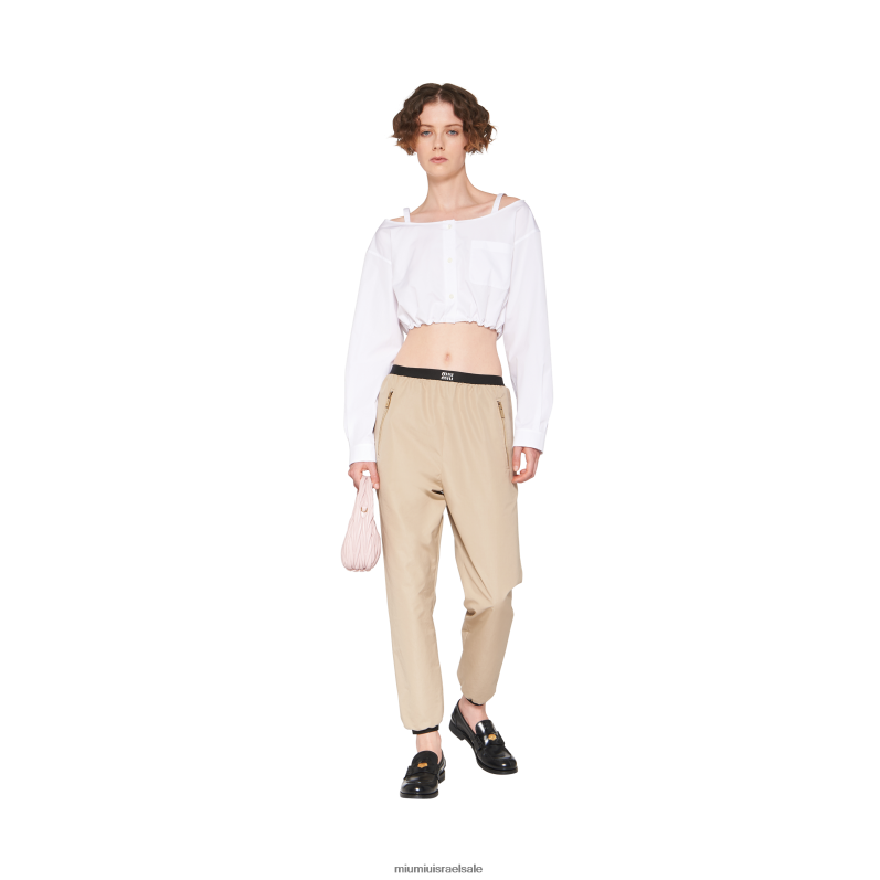 השראת הערבה פוגשת סגנון מיו מיו נינוח בחולצת הפופלין החדשה. צוואר הסירה והשוליים האלסטיים יוצרים ניגודים שובבים בנפח בעוד שהקווים החתוכים מדגישים את אופיו המודרני. הלוגו הרקום מוסיף הערה איקונית בלתי צפויה ומיוחדת בגב.