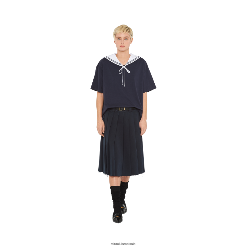 הפניות מהעולם הימי פוגשים את הנשיות חסרת הכבוד של miu miu בחולצת הכותנה החדשה הזו. צווארון המלחים הקלאסי עם פסים וחוטים קשורים בקשת מציגים פרט שובה לב וניגודיות צבע מעודנת על הבגד. הלוגו הרקום בולט בקצה הצווארון מאחור, ומשלים את העיצוב עם הערה איקונית.