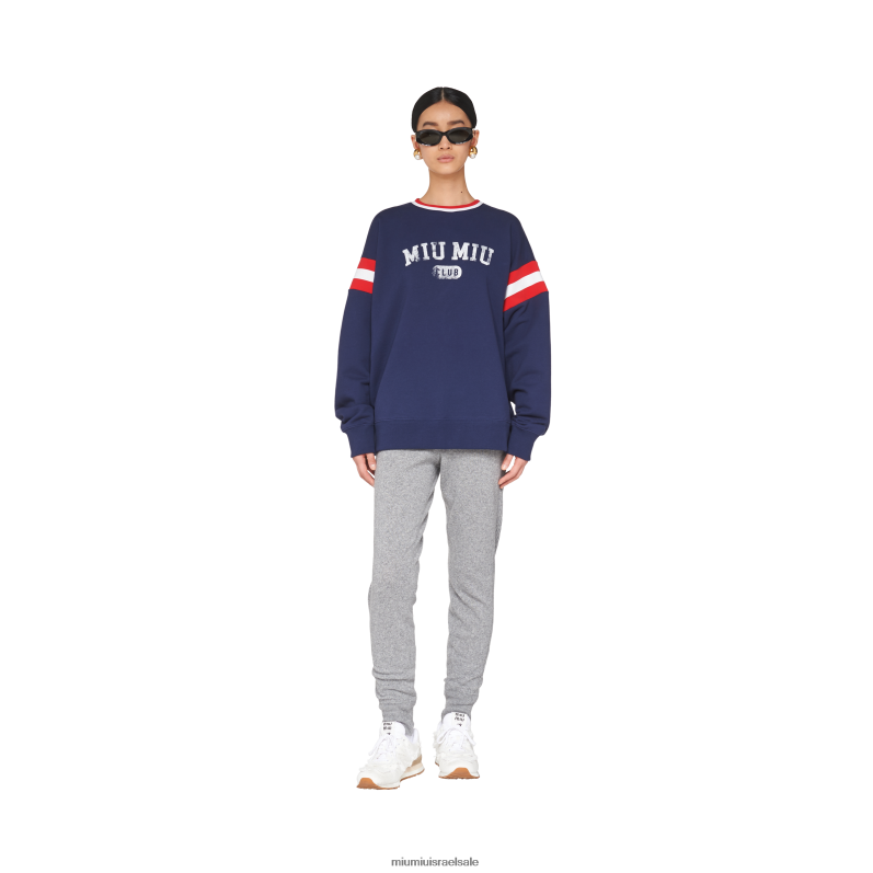 עולם הספורט משפיע על קולקציית miu miu החדשה עם צלליות גדולות ממדים, מוטיבים מודפסים, עם שילוב של התייחסויות וינטג' ומודרניזם. סווטשירט צמר כותנה זה מפרש מחדש את הלוגו האייקוני של מועדון miu miu.