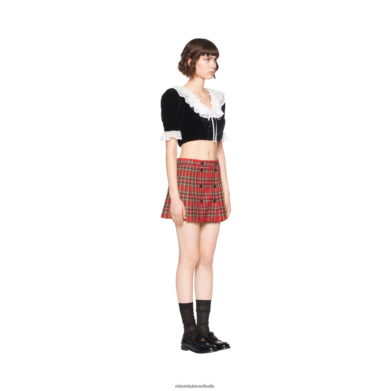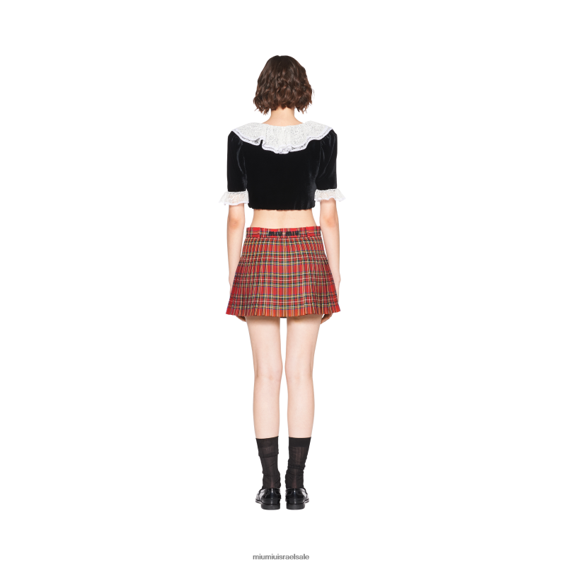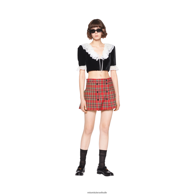 עם התייחסות לאופנת רטרו ואלגנטיות בריטית, בגד זה משלב אירוניה ורומנטיקה. הלוגו של miu miu רקום על חצאית משובצת קפלים זו.