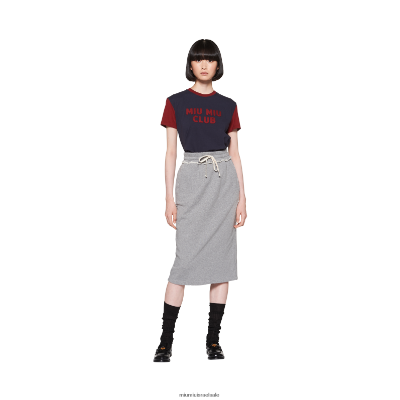 בגדי ספורט פוגשים את הנשמה המרדנית של miu miu בחצאית צמר הכותנה החדשה. הקווים הישרים והחלקים מודגשים על ידי מותני השרוך האלסטיים והלוגו הרקום שמשלים את האסתטיקה של הבגד עם מגע ייחודי בלתי צפוי.