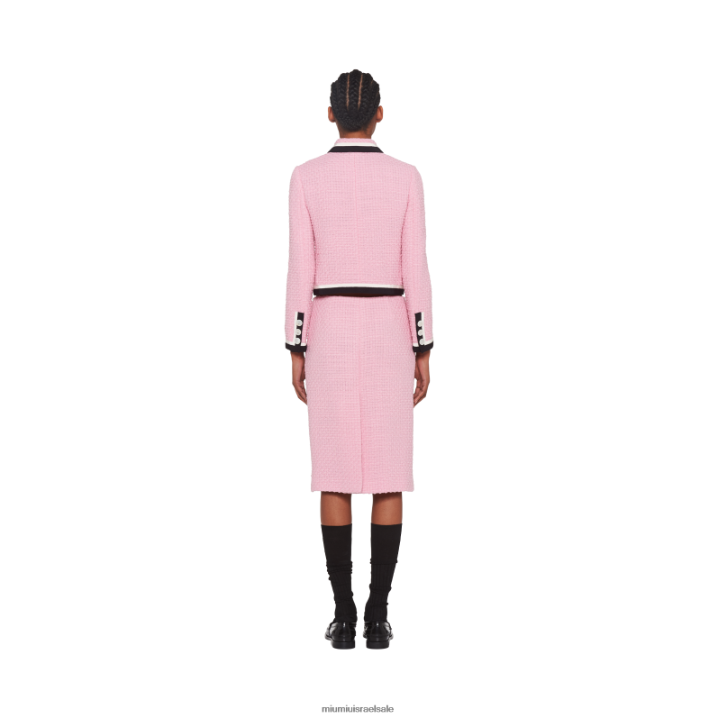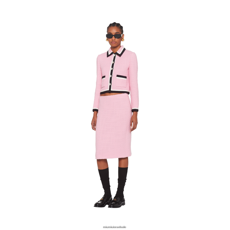 קפדנות וחופש, מודרניזם וקלאסיקה: חצאית עיפרון טוויד זו משלבת יקומים שונים המרכיבים את הדנ"א של מיו מיו. עיצוב היברידי מבד בגדי גברים מסורתי נדמה מחדש, והקו הרשמי של חייטות קלאסית הופך לביטוי חדש של נשיות.