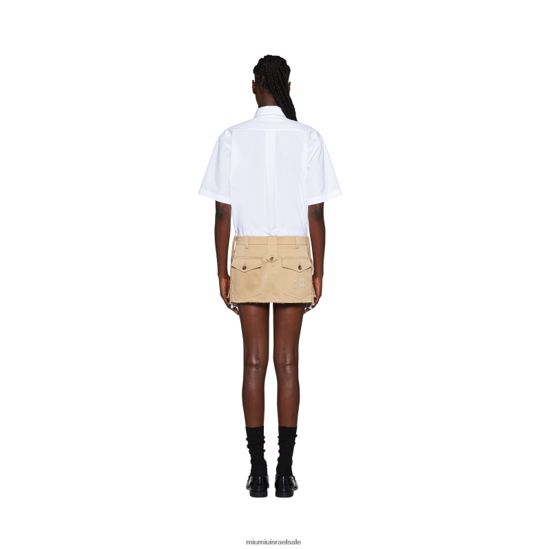 נשיות חסרת כבוד, ייחודית ולא שגרתית משתלבת עם מצב רוח שימושי יומיומי ופרטים מעודנים. בחצאית הצ'ינו החדשה, צללית חצאית המיני משולבת עם כיסים קדמיים ואחוריים עם כפתור ובטנה גלויה בכוונה. הלוגו הרקום מאחור מהווה את מגע הגימור המושלם לאסתטיקה בסגנון total miu miu.