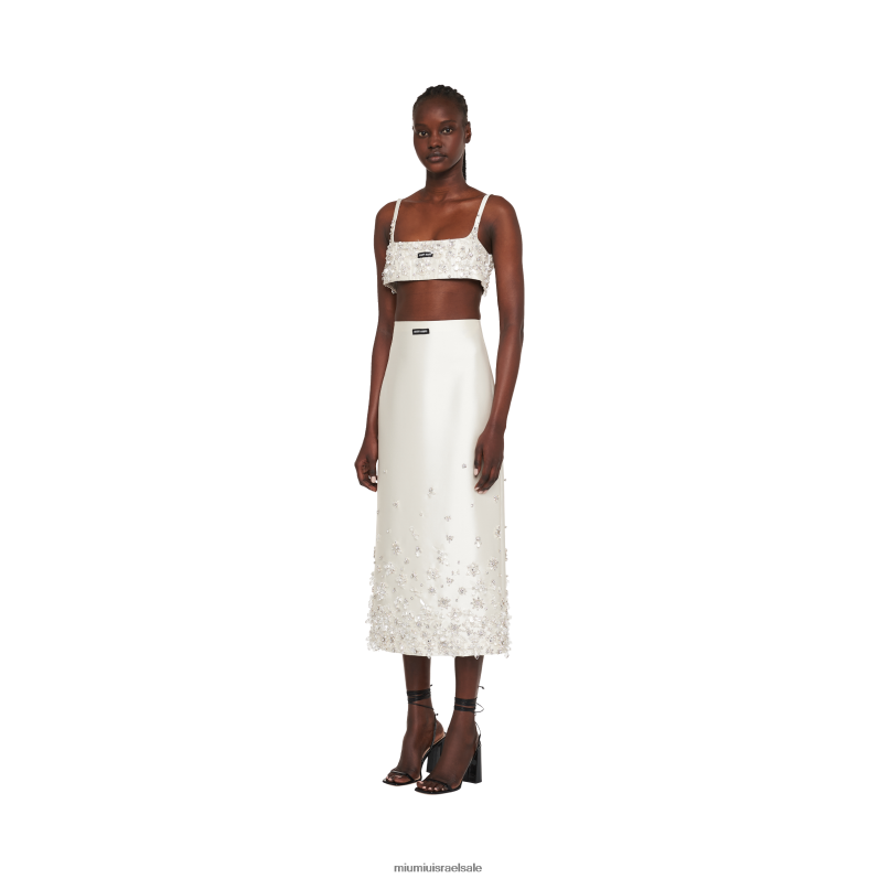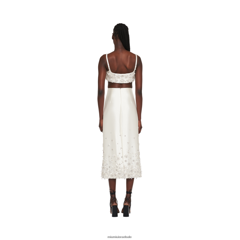 כתרגיל בהפניות ובמחקר של המציאות, נעשה שימוש בסגנונות קיימים כדי ליצור צלליות חדשות חסרות כבוד באמצעות פרופורציות חדשות ופרטים יקרים. החייטות הקלאסית מתערערת ובגדי נשים מקבלים משמעות חדשה. עיצוב ורקמה אירוניים ונשיים המפרשים עיטורי בגדי ערב מאפיינים את החצאית הזו המעוטרת בלוגו הסריג של miu miu בחזית.