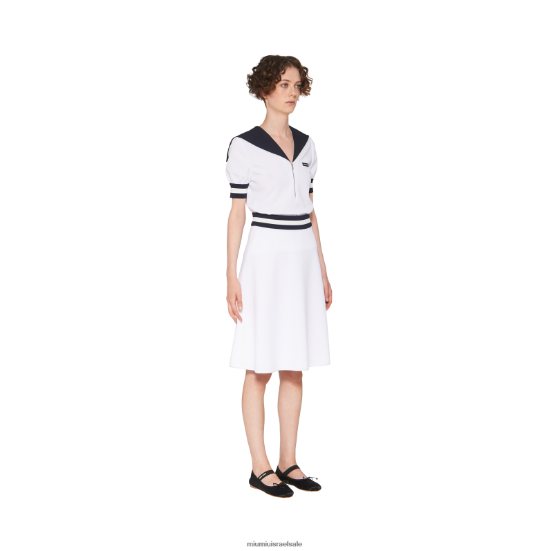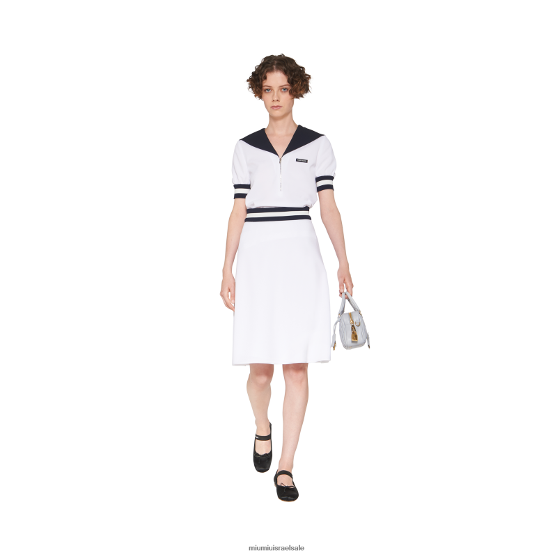 השראה ספורטיבית חובקת מצב רוח נינוח אך מעודן של Miu Miu בחצאית פיקה חדשה זו. רצועת המותן הסריג הדו-גווני מדגישה את המראה הקז'ואל של הבגד בעוד לוגו הג'קארד משלים את העיצוב עם הערה איקונית בלתי צפויה.
