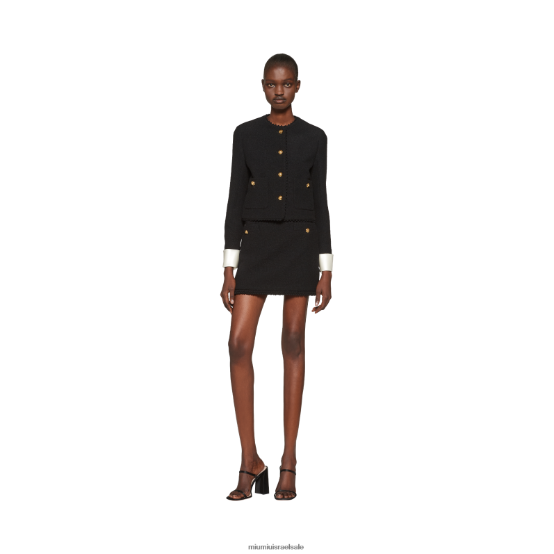 חצאית מיני בוקל זו מציעה עיצוב נקי, מינימליסטי ופשוט, הכוללת כיסים וכפתורים קדמיים, בסגנון רומנטי.