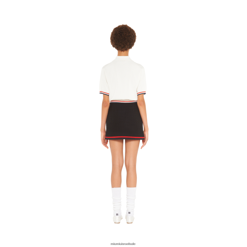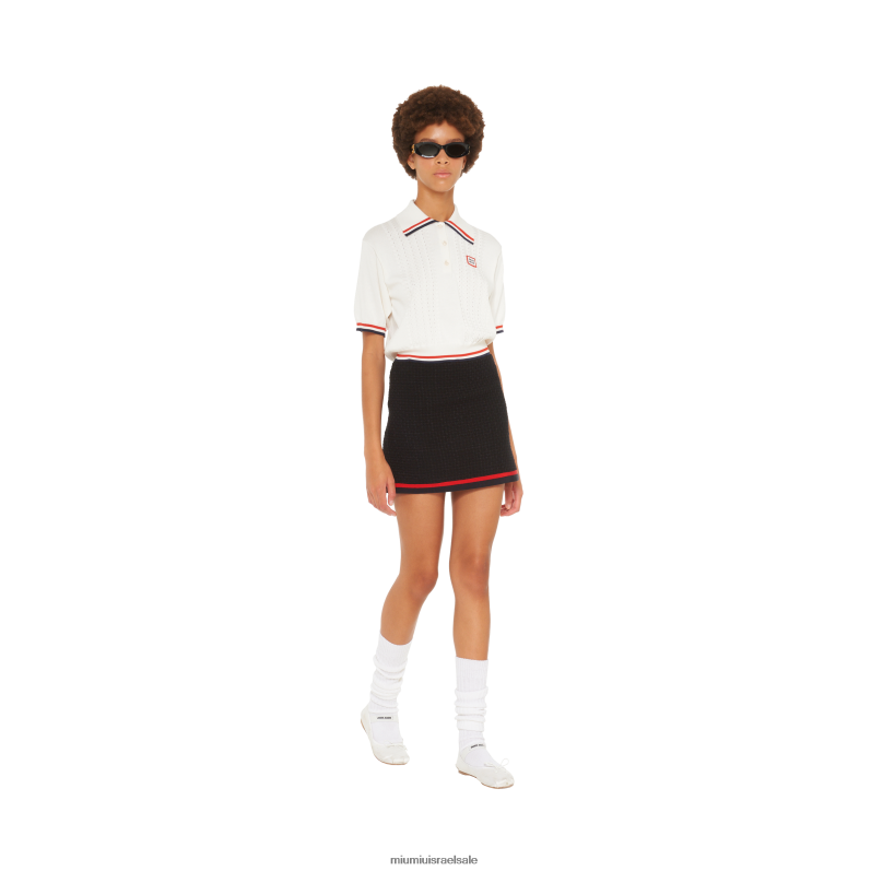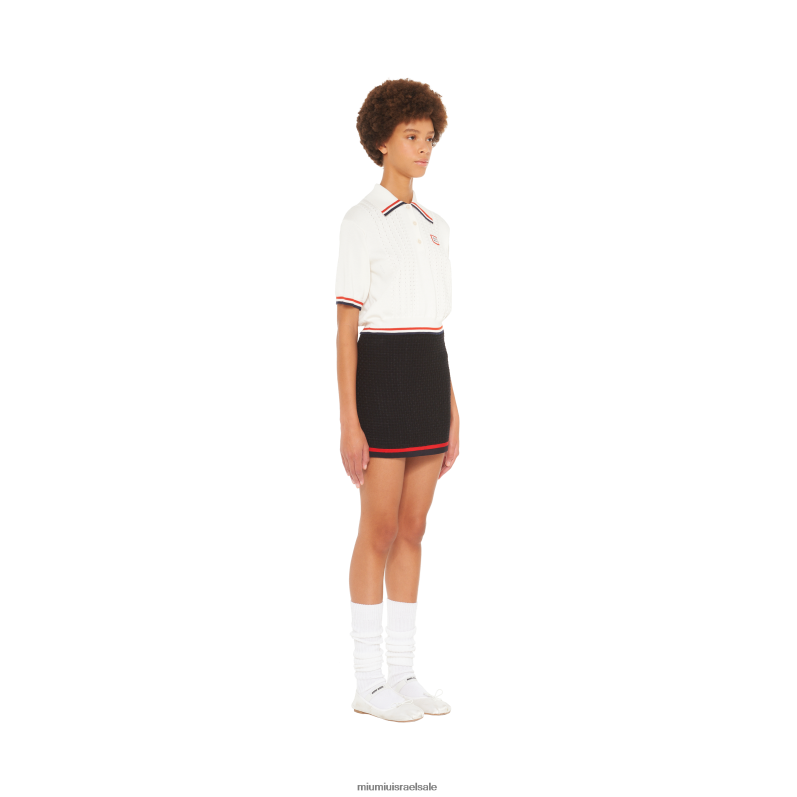 קפדנות וחופש, מודרניזם וקלאסיקה: חצאית מיני טוויד זו משלבת יקומים שונים המרכיבים את הדנ"א של מיו מיו. עיצוב היברידי מבד בגדי גברים מסורתי נדמה מחדש, והקו הרשמי של חייטות קלאסית הופך לביטוי חדש של נשיות.