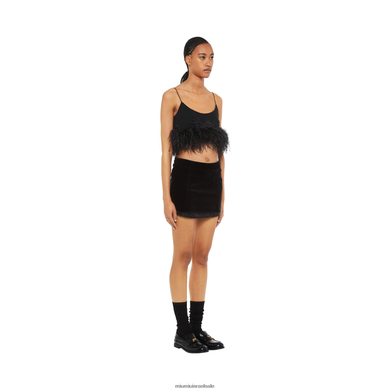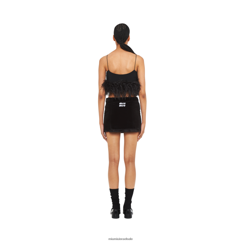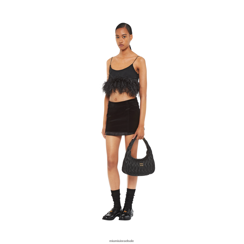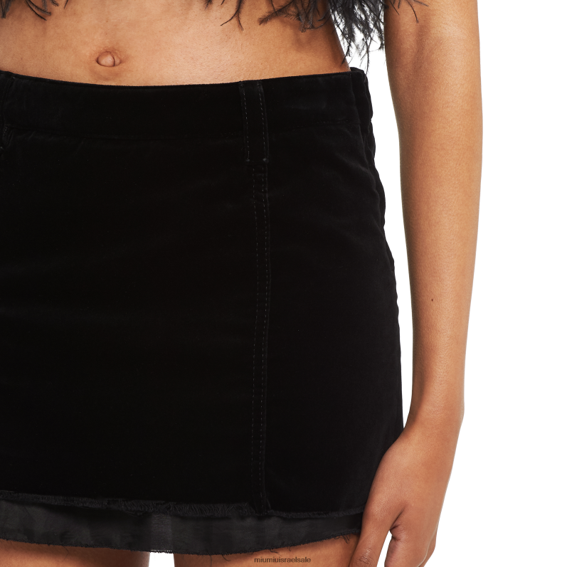 השפעות של בגדי רחוב פוגשות את הפיתוי הרומנטי של miu miu בחצאית המיני הקטיפה הזו. המכפלת בגזרה הגולמית היא נושא מרכזי של הקולקציה החדשה, ומקשטת בגדים עם תחושה מרדנית.