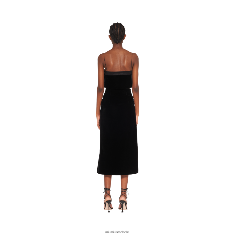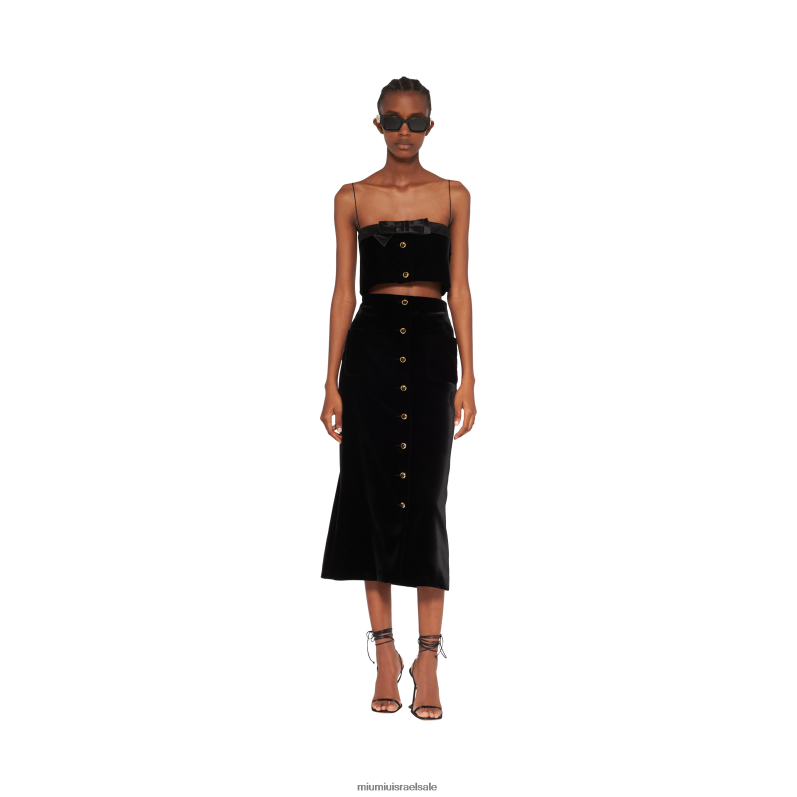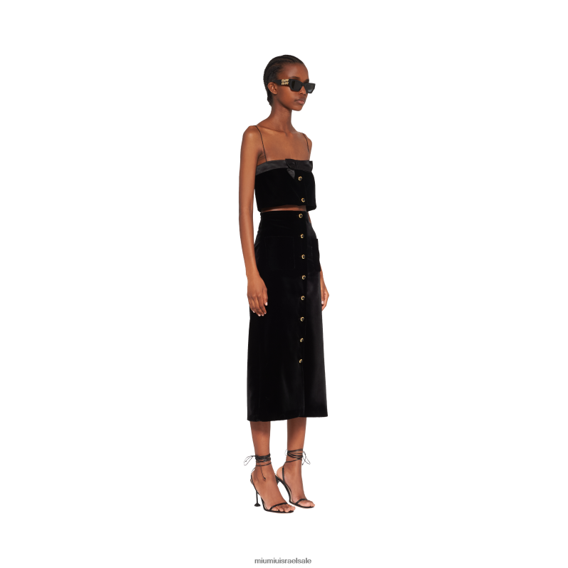 החצאית הארוכה הזו משדרת אלגנטיות ותחכום, מוארת על ידי ססגוני הקטיפה. העיצוב בעל הקווים הנקיים מועשר בכפתורים קדמיים מבריקים.