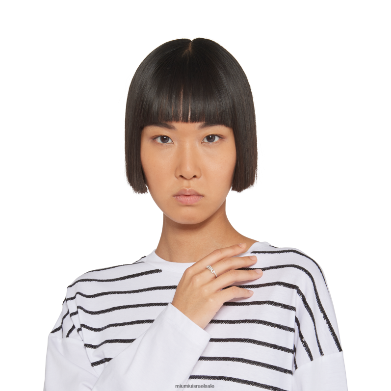 הלוגו של miu miu הוא הגיבור של הטבעת הזו. קריסטלים נוצצים מקשטים את היצירה הזו, ויוצרים ניגוד נשי עם גימור הפלדה המודרני של המתכת.