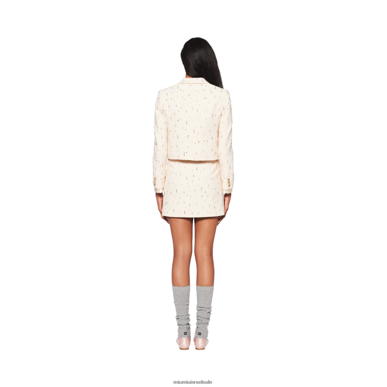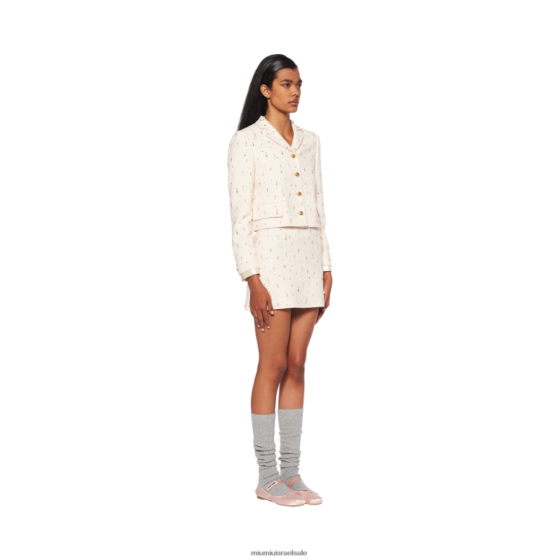 ז'קט רקום דק זה מגלם שילוב של פשטות מודרנית ופיתוי רטרו. miu miu משחקת עם מוטיבים קלאסיים וקווים מחויטים כדי ליצור עיצובים חדשים בהגדרה חדשה תמיד של נשיות.