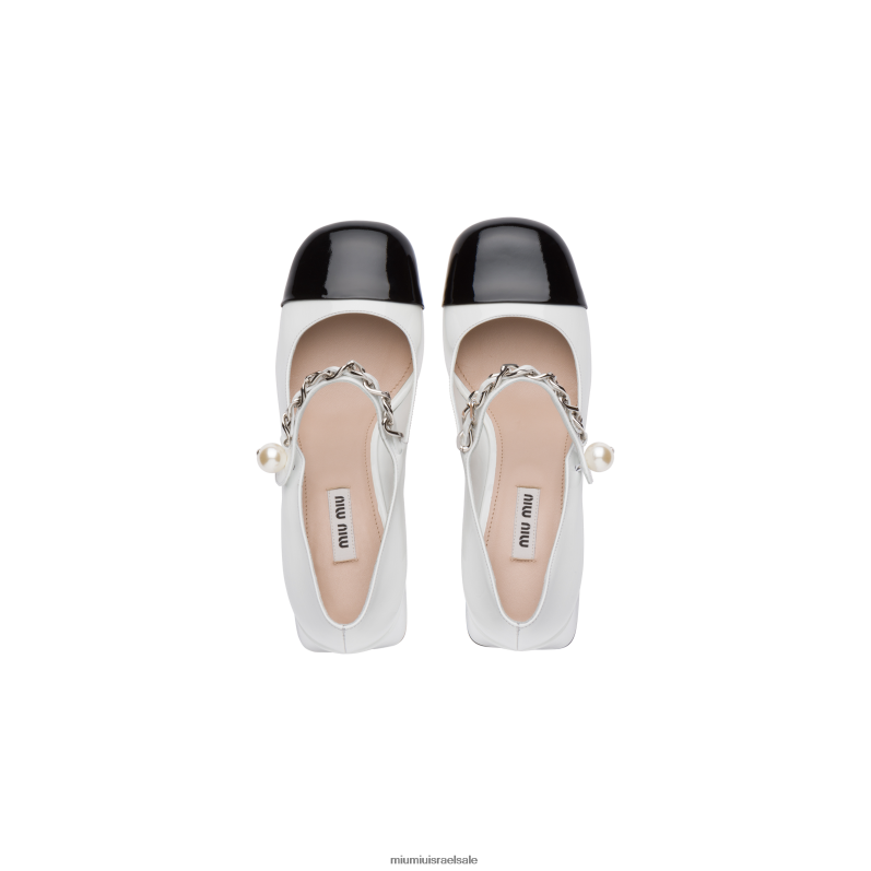 עיצוב רומנטי ופרטים מעודנים מגדירים משאבות מעור פטנט אלה. רצועת הידיים עם שרשרת מתכת ופנינה על הסגירה מדגישה את הנעל, ומזכירה את עולם התכשיטים. ניגודיות הצבע בין הבוהן לחלק העליון בולטת.