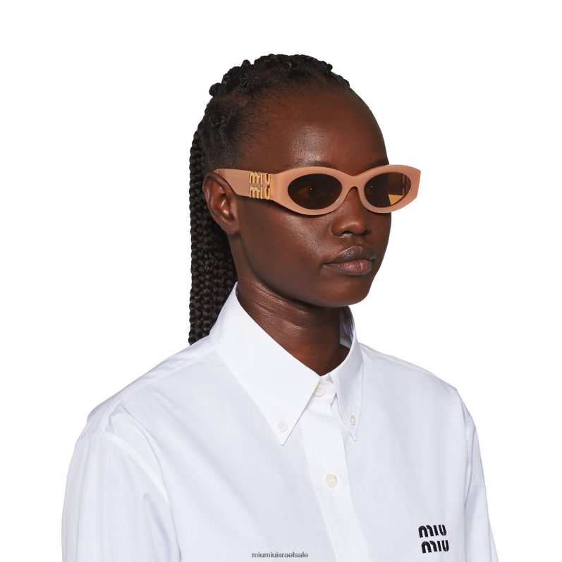 משקפי שמש אצטט עם עיצוב סגלגל המגלם נשיות נועזת ומתוחכמת. חזית המסגרת הצרה משופרת על ידי הלוגו האנכי החדש של miu miu המשולב בצירים של הרקות השמנמנות.