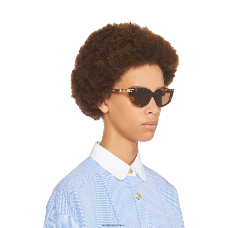 משקפי שמש אצטט בעין חתול עם פיתוי נשי במיוחד. חזית המסגרת, המאופיינת בחישוקים משופעים עכשוויים, משולבת עם רקות מעוטרות בפרטי שרשרת תכשיטים יקרים הכוללים את הלוגו של miu miu.