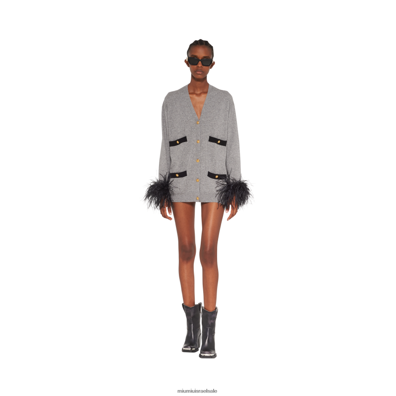 חוזק ושבריריות, פרטים המגדירים מחדש צלליות קלאסיות ונקודות מבט של ארון הנשים. קרדיגן קשמיר יוקרתי זה, בסגנון רומנטי, משחק עם הסגנונות האופייניים של המותג, כולל יצירה וחדשנות אומנותית, ומקושט בנוצות בחפתים.