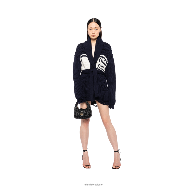 סריגים מבדים רכים מעודנים פוגש השפעות ספורטיביות, עם טכניקות אומנותיות ועיצוב בהשראת בגדי רחוב. הלוגו המשובץ של miu miu מנוגד לבגד עם צללית אוברסייז.