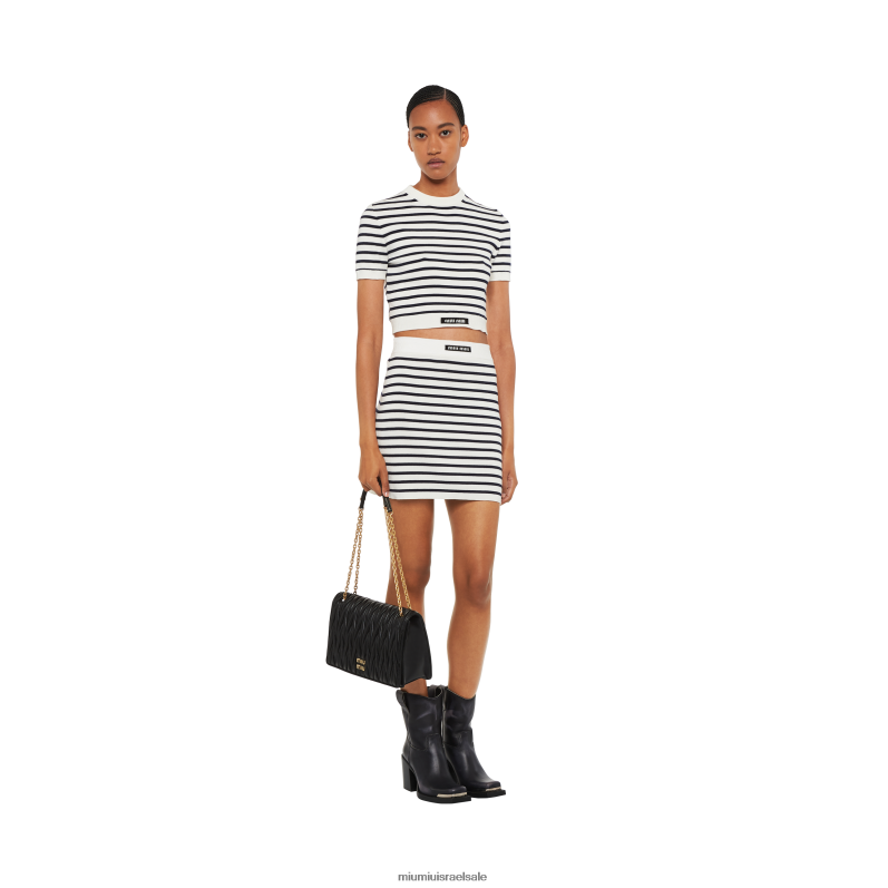 עולם הפסים פוגש את האופי הפרובוקטיבי של miu miu בסוודר החדש הזה מכותנה עם צווארון עגול. הקווים החתוכים מלווים בגזרי סריג מצולעים ומשווים לבגד מראה עכשווי. הלוגו של אינטארסיה בצבע מנוגד על המכפלת משלים את העיצוב עם הערה איקונית.