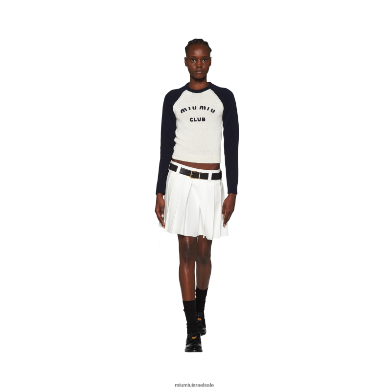 הצטרפו למועדון miu miu. חוגגת נשיות מודרנית וחסרת כבוד, העיצוב של הסוודר הזה משלב את האיכות של קשמיר עם עיצוב קז'ואל בהשראה ספורטיבית. הכתף raglan וסיפור הצבעים הדו-גוני משלימים את העיצוב המעודן של הסוודר.