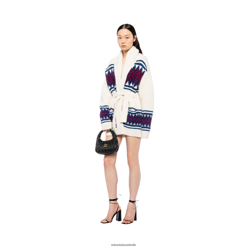 מוטיבים גיאומטריים רקומים בעבודת יד עם מצב רוח אלפיני מקשטים את סוודר הצמר הרך הזה. המשלבת אומנות וחדשנות, miu miu מציגה קולקציית סריגים מתוחכמת המשלבת קודים סגנוניים שונים.