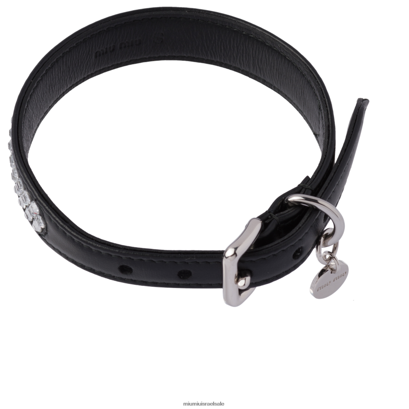 המזכירים את עולם התכשיטים, צווארון חיות מחמד זה משובץ בקריסטלים משובצים. הלוגו של miu miu מקשט את הקסם על האביזר.