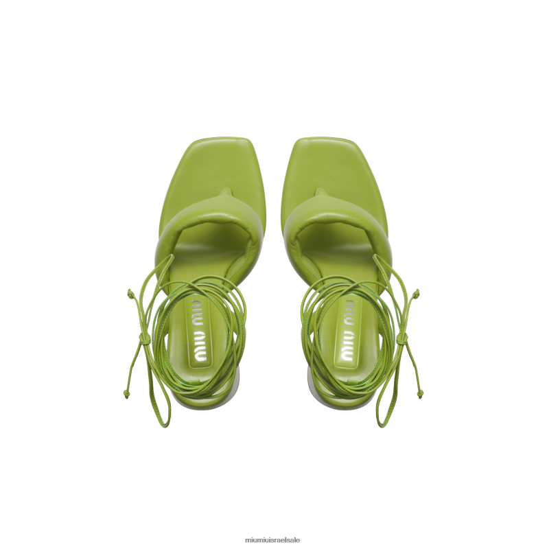 קווים נועזים ואופי עצבני הם המרכיבים המובהקים של סנדלי חוטיני עור חדשים אלה. הלוגו החתום מקשר אותם לאישיות החלטית וחסרת הכבוד של מיו מיו. השרוכים שנקשרים מסביב לקרסול משלימים את העיצוב הזוהר של הנעל.