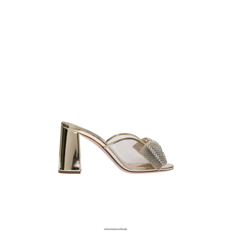 miu miu משחק עם פרספקס שקוף כדי ליצור עיצובים חדשים עם אופי נשי. הסנדל הזה מעוטר בקשת וקריסטלים, מושלם לעונה החמה, מגלם מודרניות שובבה.