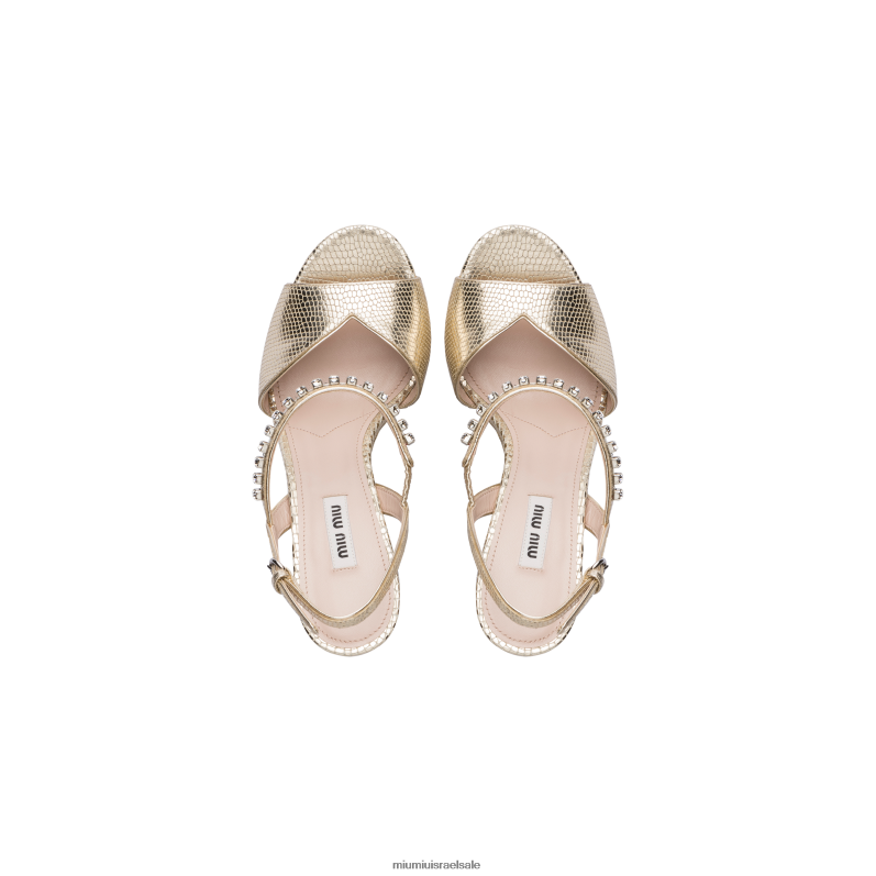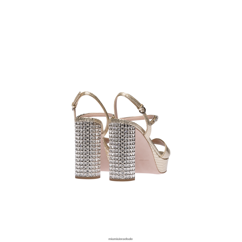 צללית מתוחכמת מאפיינת את סנדלי העור החדשים הללו של miu miu. הדפס הלטאה משפר את הסנדל המואר על ידי קריסטלים על הרצועה.