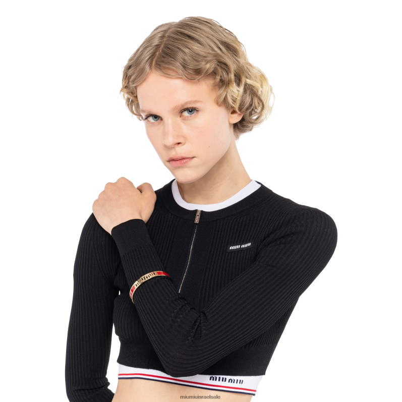 הלוגו של miu miu הוא הגיבור של מבחר צמידי מתכת עם אמייל. הסמל האיקוני בולט ונותן לאביזר פיתוי מודרני.