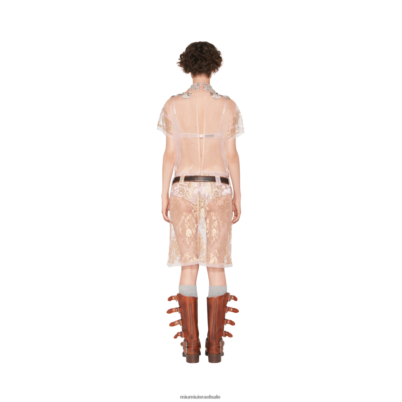צללית בלתי מורגשת עם פיתוי רטרו אך אולטרה-מודרני: miu miu שוקלת מחדש את הפרופורציות על ידי הגדרת קונספט חדש של נשיות. רקמה מתוחכמת בצווארון ותוספות שקופות מגדירים את שמלת התחרה הזו.