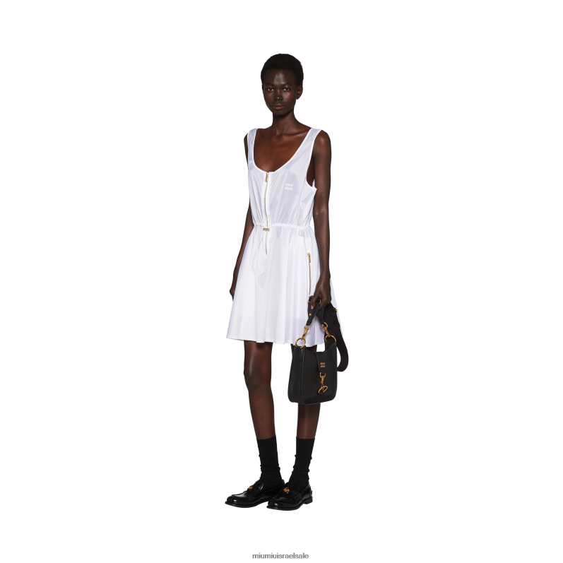 שמלת המשי הטכנית החדשה מבטאת אסתטיקה נינוחה, עצבנית אך נשית. הרוכסנים המנוגדים והלוגו המודפס מוסיפים פרטים ייחודיים בעוד שהמוטיב המחורר מעניק לבגד קלילות.