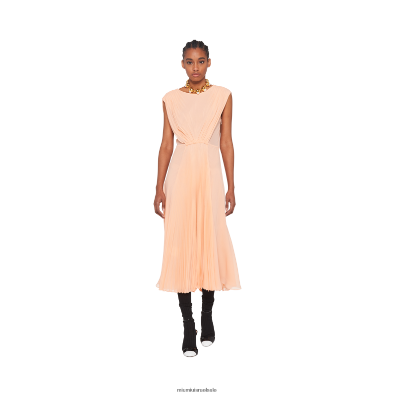 אלגנטיות ערטילאית ונצחית מתעצבת בצללית הנוזלית של שמלת ג'ורג'ט זו. הבד הקל מאופיין בקפלים המחייה את העיצוב.