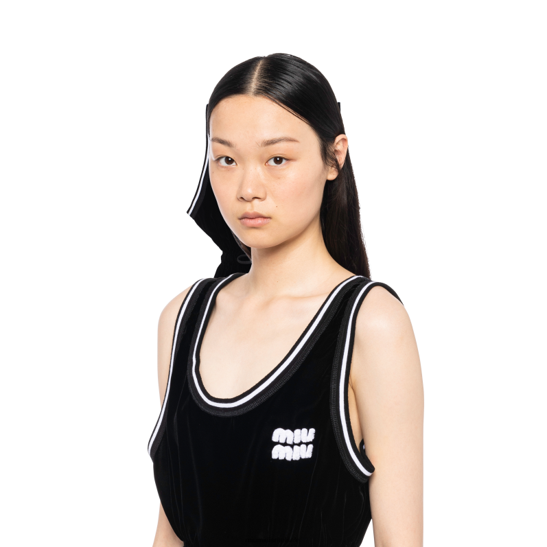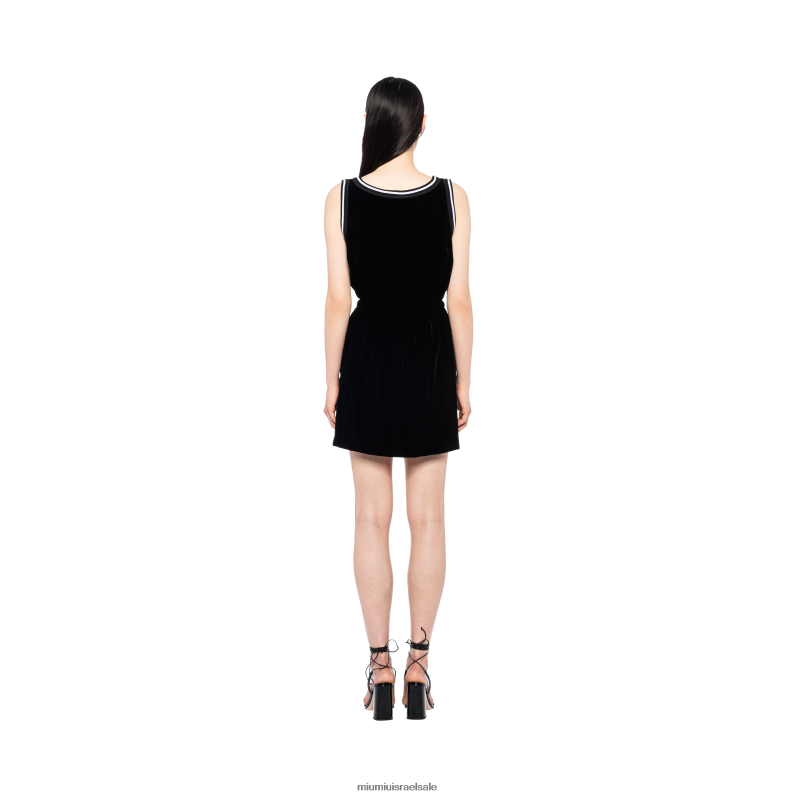 בגדי ספורט מהווים השראה לעיצובים ופרופורציות חדשות, ומציגים השקפות מקוריות על נשיות. שמלת קטיפה זו משלבת מודרניזם ורומנטיקה מתוחכמת, וכוללת פרטי סריג בעוד הלוגו של miu miu מופיע רקום בחזית.