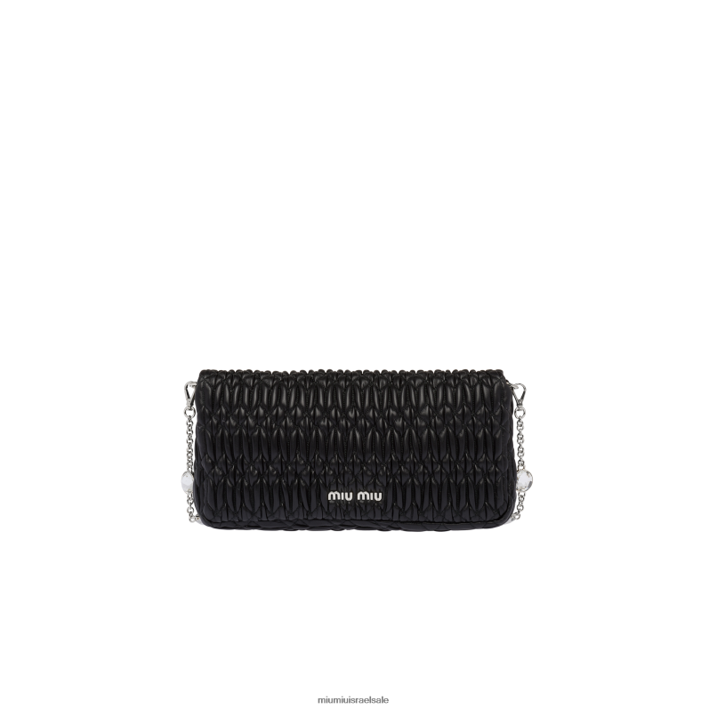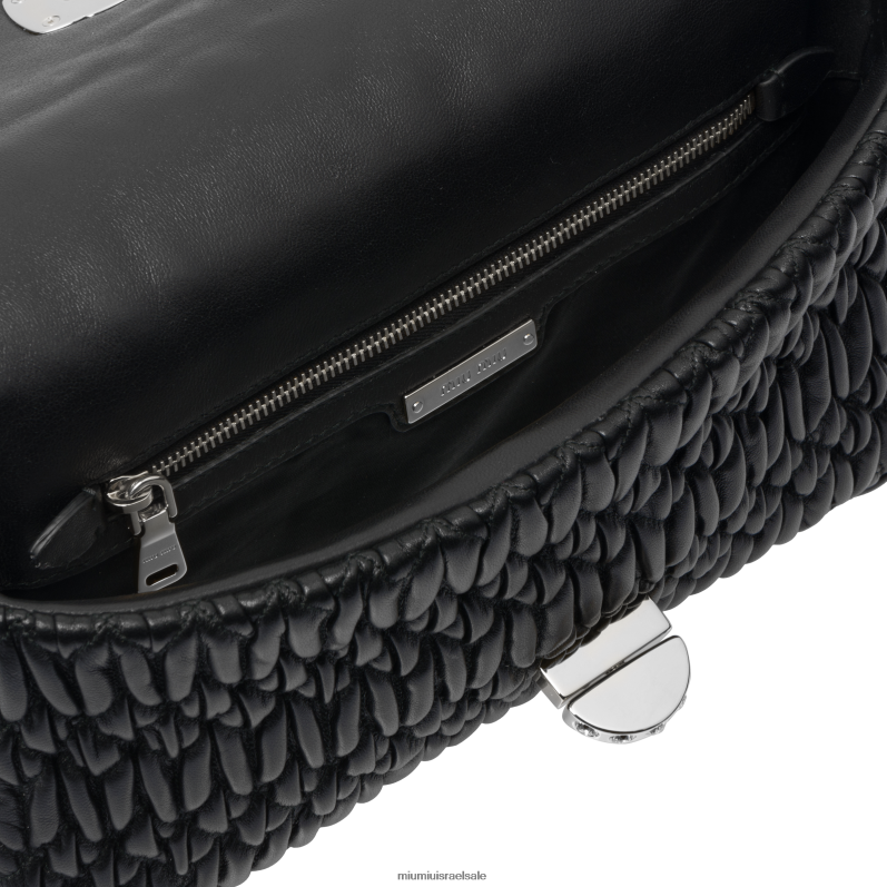 מוטיב הארון האייקוני מייחד את העיצוב של תיק הקריסטל של miu, כאן עם רצועת כתף כפולה: עם קריסטלים ועור נאפה ארוג. האביזר מואר על ידי הסוגר משובץ הקריסטל.