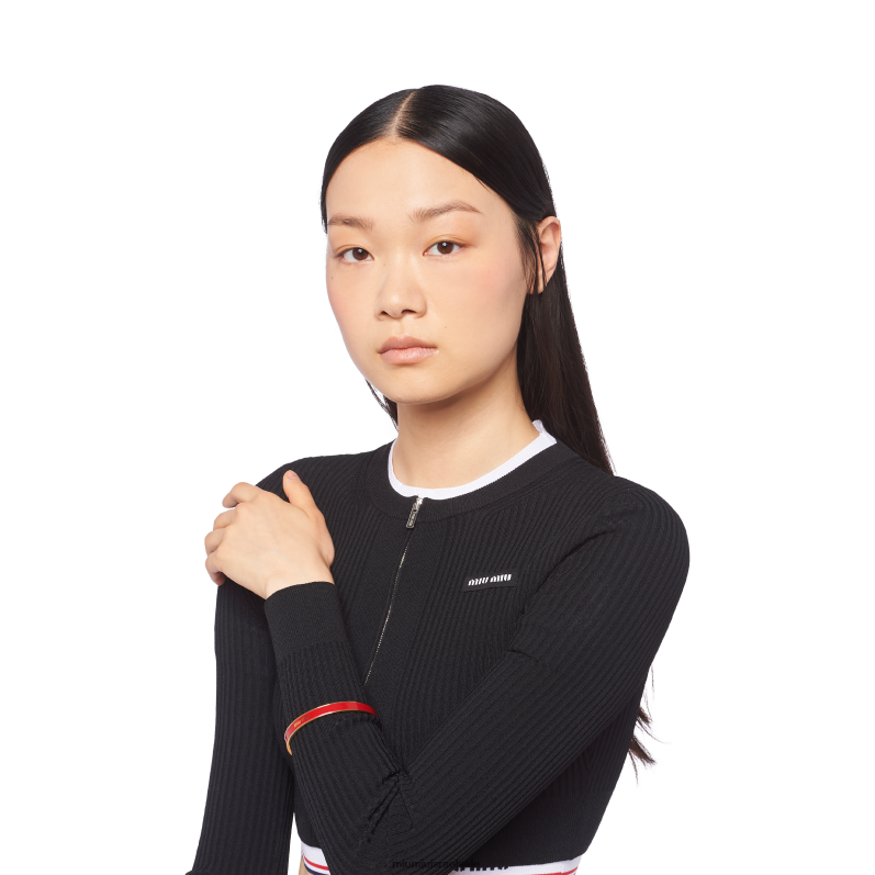 הלוגו של miu miu הופך לגיבור של מבחר צמידי מתכת מצופים אמייל. הוא בולט כסמל איקוני, ונותן לאביזר פיתוי מודרני.