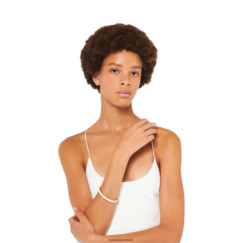 הלוגו של miu miu הופך לגיבור של מבחר צמידי מתכת מצופים אמייל. הוא בולט כסמל איקוני, המעניק לאביזר פיתוי מודרני.